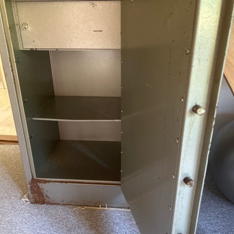 Skabet viser tydelige tegn på alder og brug, men virker 100% funktionelt.