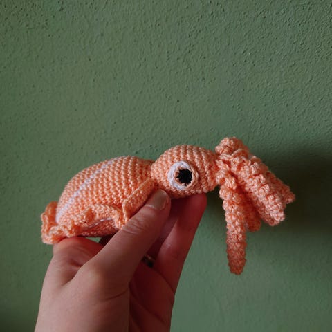 Håndhæklet blæksprutte i blødt bomuldsgarn.