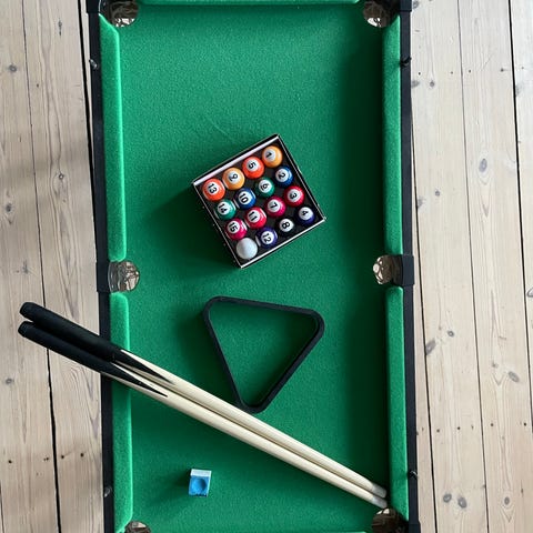 Game Table Multi-Function Spillebord med rød overflade. Bordet kan bruges til pool, bordtennis og air hockey, hvilket gør det alsidigt til forskellige spil. Inkluderer tilbehør som poolkøer, kugler, bordtennisbat, bolde og air hockey-puck. Bordet har en robust konstruktion med sorte ben.