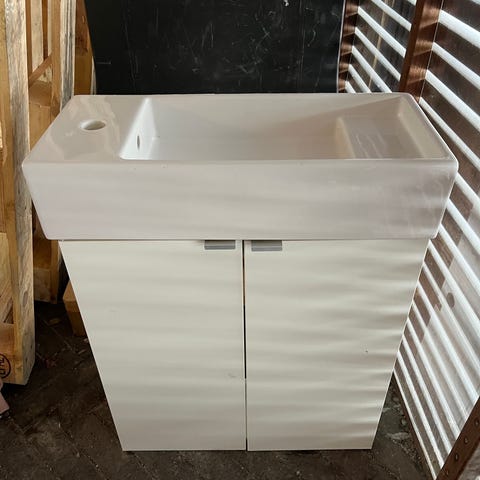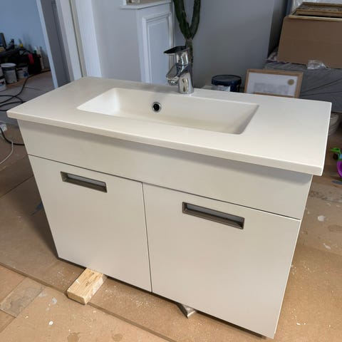 Vaskeskab med integreret vask og armatur. Skabet har to skuffer til opbevaring og eg moderne, firkantet armatur. Vasken er hvid med en afløbsprop i metal.