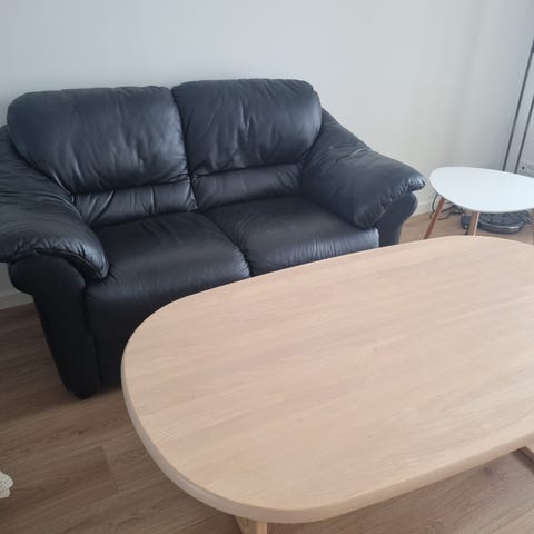 2 pers sofa i sort imiteret skind. Én hynde er skadet/slidt.