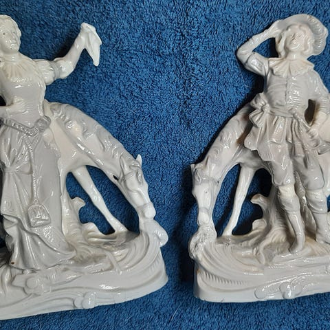 Vi sælger et par porcelæns statuetter, som forestiller en dame og en mand ved siden af deres heste. Figurerne har hvide og lysegrå farvenuancer. Bredden er 12cm og højden er ca. 18cm