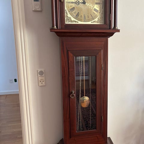 Virkelig smukt ur i maghoni af Matz Wied Satrup fra Sottrup fra ca 1870. Har været i familiens eje i ca 100 år, men har ikke været i brug siden 2001. Trækkes manuelt op med medfølgende nøgle. Har en enkelt skramme, se billede, men ellers kun smukke brugsspor.