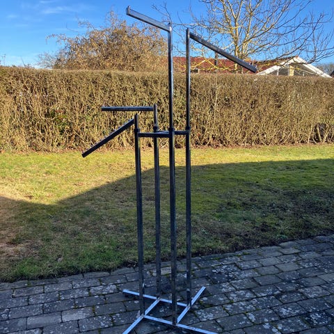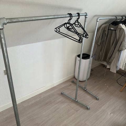 Garderobestativ. Hvidmalet stål i god og stabil kvalitet. Har både stativer med messing stang og med rustfri stål stang.