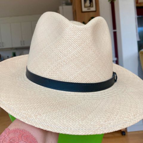 Hat, Panamahat, str. 59, Råhvid, Strå, Ubrugt, Helt ny og ubrugt Panamahat i strå med sort bånd. Ca str. 59/58. Dejlig luftig hat til varme sommerdage (de kommer igen :-)) Står på Mols men kan gratis leveres i Aarhus eller Ebeltoft. Kan også sendes billigt på købers regning
