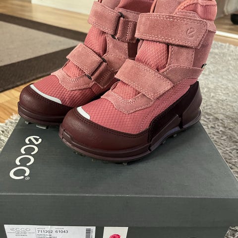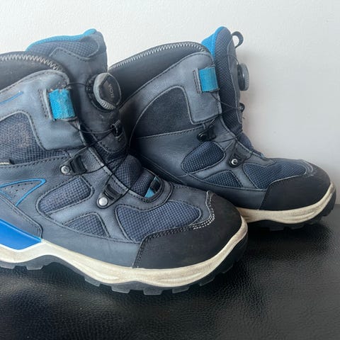 ECCO børnestøvler, blå, i størrelse 37. Skoene har en robust sål med mønster for bedre greb og er designet til børns brug. Brugt 1 gang indendørs, så de er så gode som nye. Praktisk lukning (boa). GoreTex og super komfortable.