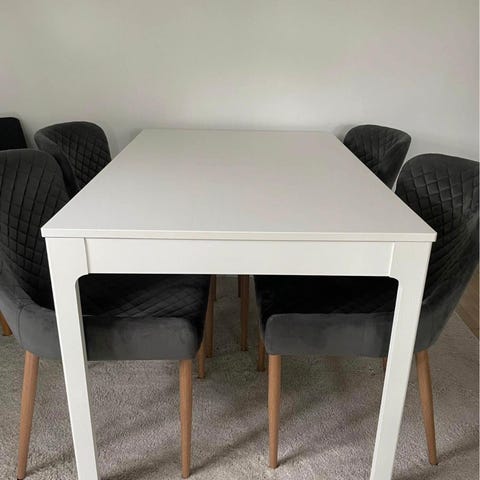 Pænt og velholdt spisebord med udtræk og 2 tillægsplader som gør det nemt at dække op til flere gæster.