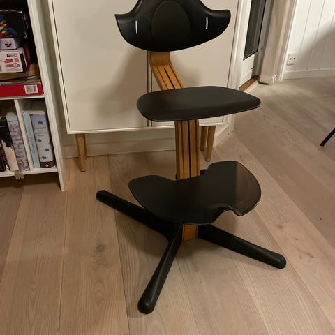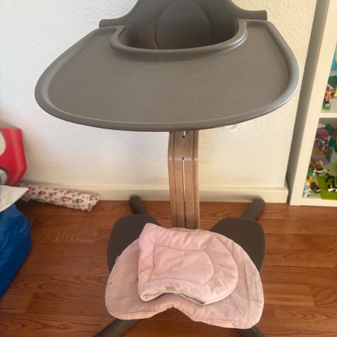 Stokke Nomi højstol med sort træramme og gråt betræk. Højstolen er designet til børn. Det er en ergonomisk stol, der vokser med barnet, da den har justerbare funktioner for komfort og støtte. Inkluderer aftagelig bakke i sort materiale, der kan fastgøres til stolen. Betrækket er polstret for ekstra komfort.