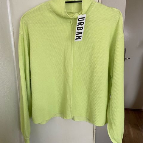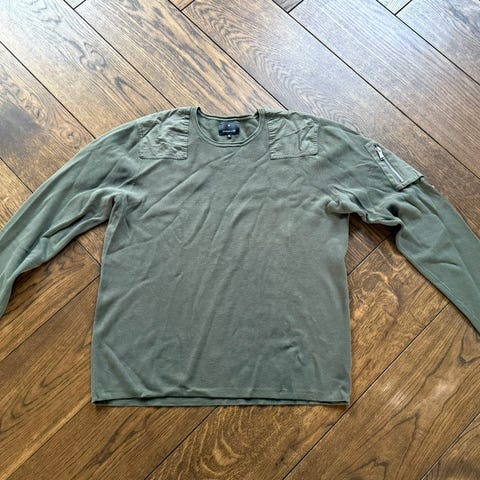 Ny mørkegrøn bluse med rund hals, lange ærmer, ribkant på ærmer + ved halsen. (Lyset dårligt på foto)