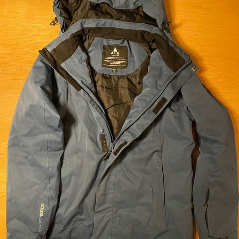 Jakken har hætte (aftagelig) og bukser har seler (aftagelig).
