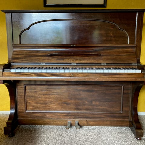 Steinbeck klaver, opretstående i lyst træ. Klaveret har været løbende stemt og vedligeholdt.