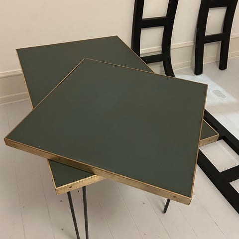 Charmerende spisebord i grøn linoleum med kantlister i massiv messing med historie, fra den tidligere Lyngby Post Pub.