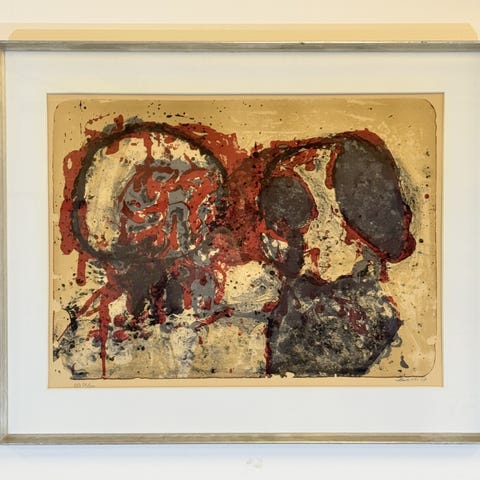 Det måler omkring 53x45 m ramme. Der står lidt om litografiet på bagsiden. Afhentning er i Rødovre, andet kan aftales.