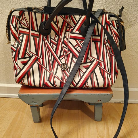 Tommy Hilfiger skuldertaske i stofmateriale. Tasken har et unisex design med en kombination af lyse og mørke farver samt røde detaljer. Tasken har flere rum og justerbar skulderrem, hvilket gør den velegnet til daglig brug.