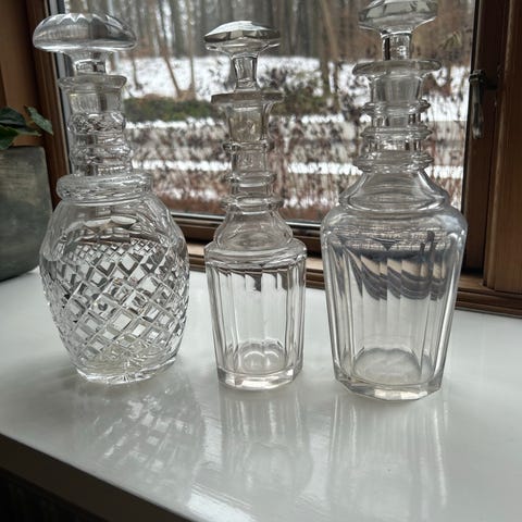 Dekanter og glas sæt med grønne og guld dekorationer. Sættet indeholder en stor dekanter med låg samt seks små glas. Materiale og specifikke dimensioner er ikke angivet.