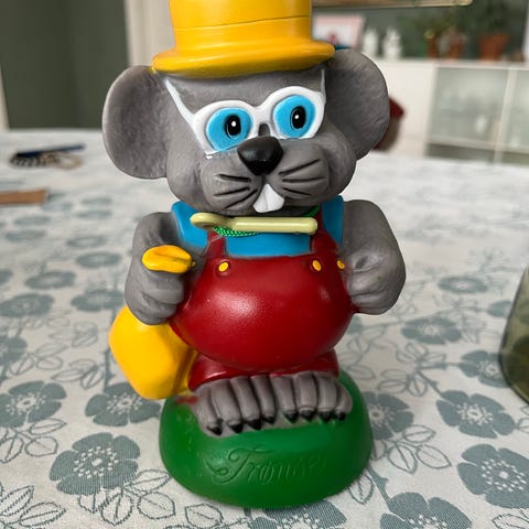 Brun plastik hest sparebøsse med hvidt mærke på panden og hvide sokker på benene. Sparebøssen har en åbning til mønter på ryggen og en skrue på undersiden for at tømme den. Figuren ligger ned på en grøn base.Sender gerne køber betaler porto