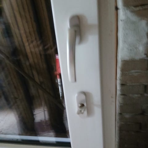 Bredde 74,8 cm højde 196 cm udvendig karm mål. Venstre ind. . Siddet i sommerhus ud til tag, hvortil der ikke var adgang.