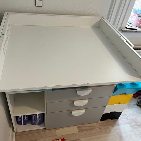 IKEA puslebord med skuffer i hvid. Puslebordet har en overflade til pusling og flere opbevaringsskuffer under, hvilket gør det praktisk til opbevaring af babyartikler. Står til 1600 DKK på hjemmesiden.