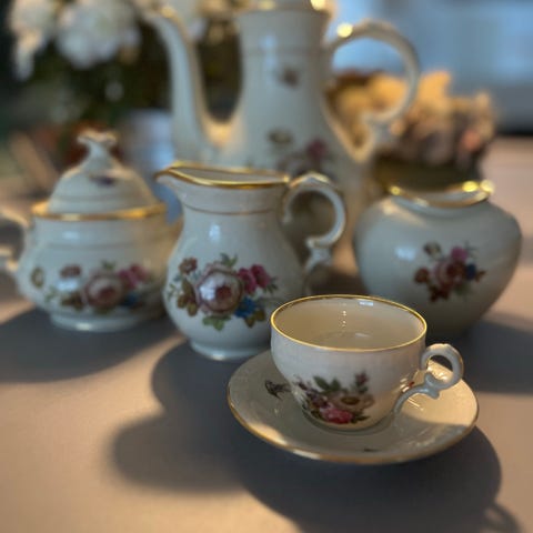 Smukt og fuldt komplet kaffesæt fra Københavns Porcellains Maleri A/S (KPM), ca. 1910–1930.