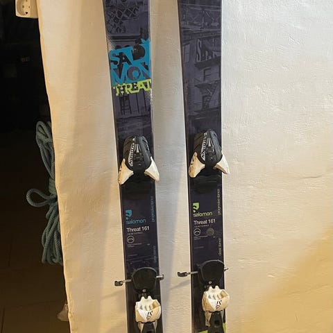 Et par fine twin tip ski fra Salomon med salomon bindinger. L 168 cm