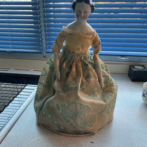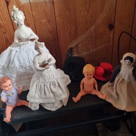 Sæt bestående af antikke pyntefigurer, hver med en porcelæn overkrop og beklædt med forskellige stofkjoler med blonder og perler. Figurerne er håndlavede og designet som små damer i historiske kjoler, anvendt som dekorative genstande. Prisen er for et stk.