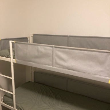 Køjeseng i hvidpimenteret træ. 90x200 cm. Med to skummadrasser og to topmadrasser. To legetøjsskuffer.