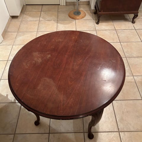 Bord og stole fremstår pæne, men der er et par mindre hakker i bordets overflade, som ikke påvirker funktionaliteten og kun er kosmetiske. Stolene er stabile og i god brugbar stand.