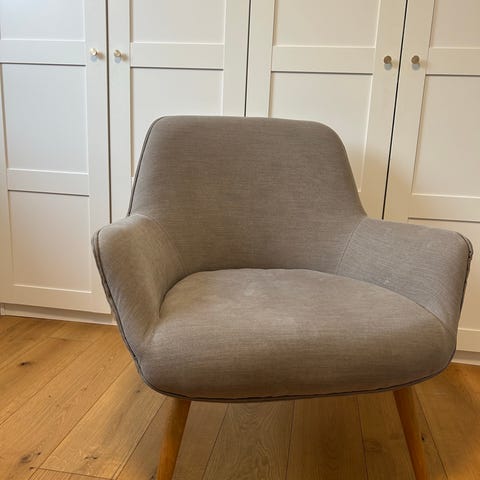 Lækker lænestol, lys varm grå, god siddekomfort, læderkant og egetræsben. Sælges da farven ikke matcher vores øvrige møbler. Nypris 5000 kr.