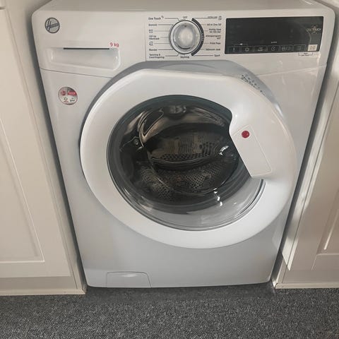 Hoover vaskemaskine med hele 10 kg. vaskekapacitet, 1600 o/min centrifugering, dampfunktion og mulighed for Wi-fi tilslutning. Den har været til reparation og fået ny motor og print, og er testet flere gange på værksted og fungerer som ny igen.