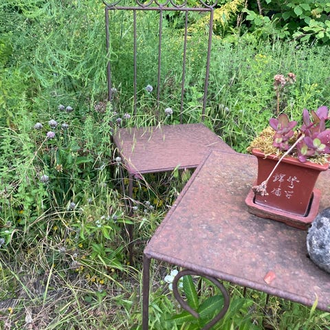 Jernbord og -stole til udendørs brug, bordhøjde 73 cm, omkreds 95 cm, stolhøjde 1 m, bredde 55 cm, dybde 40 cm, sædehøjde 44 cm.