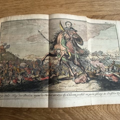 Anden udgave, 1703, Leiden af Pierre Aander Aa, på fransk, Le grand theatre historique, ou, Nouvelle histoire universelle… af Nicolas Gueudeville, Jacobus Baptist, Ottmar Elliger / Romeyn de Hooghe, Jan Van Vianen, Jan Goeree, læderbind i én samling med to dele (Tome I & II), 741 sider, folioformat (36 × 24 cm), talrige kobbergraveringer inklusive et stort verdenkort og slagscener, i meget god stand. Klik på den blå "gå til varen" knap, for at købe eller byde på denne vare. Den samlede pris vil blive vist inden du afgiver dit bud.