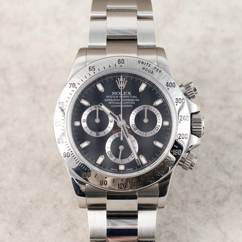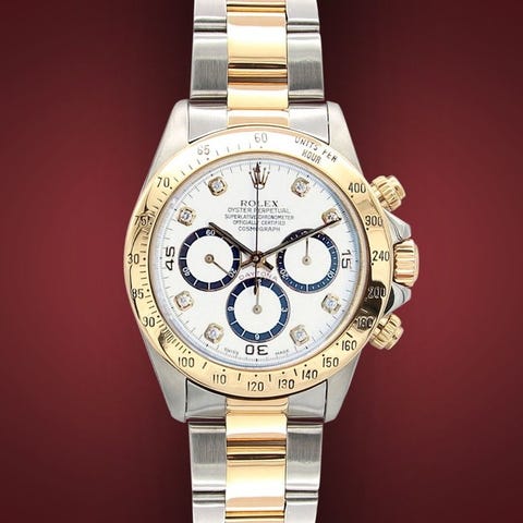 Denne Daytona er i gult guld med en hvid urskive med sorte subdials.