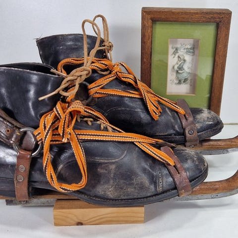 Originale ishockeyskøjter til indretningsdekoration; sportsfodtøj i gennemsnitlig stand. Klik på den blå "gå til varen" knap, for at købe eller byde på denne vare. Den samlede pris vil blive vist inden du afgiver dit bud.