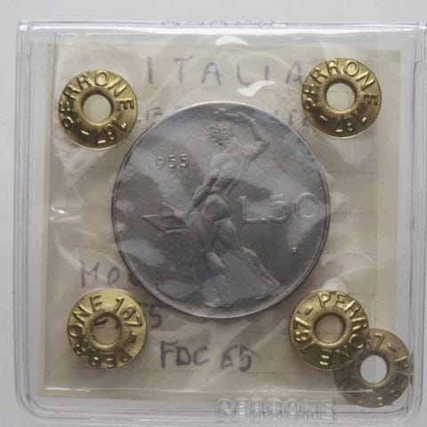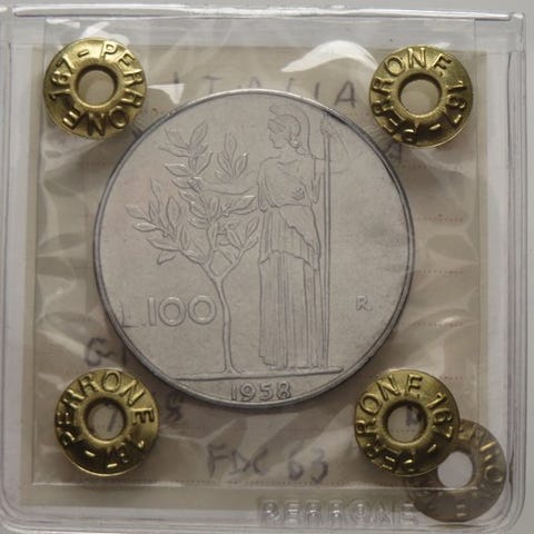 Italien 100 Lire 1960 'Minerva', ugraderet mønt, periceret af Numismatica Perrone Fabio som FDC 64, Gigante-katalogpris FDC 500 euro. Klik på den blå "gå til varen" knap, for at købe eller byde på denne vare. Den samlede pris vil blive vist inden du afgiver dit bud.