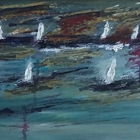 Olie på lærred fra 1964 af Serge Labégorre, født i 1932, der forestiller kajerne, lot nr. 14.