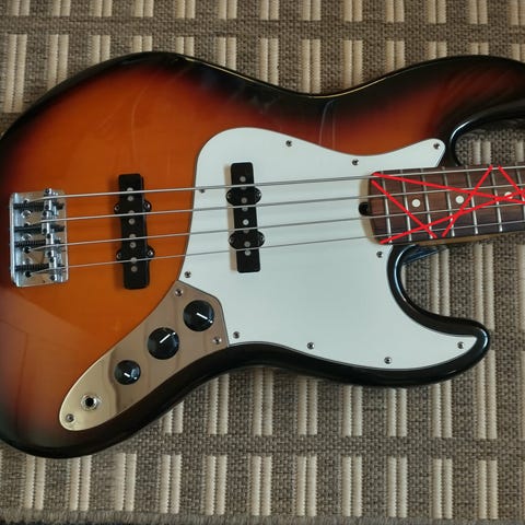 Et brud ved pickguardet, som er blevet repareret, er synligt. Der er også en repareret finish-flække ved siden af kroppen på bassen, lige ved kanten af kroppen.