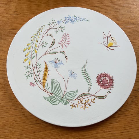 Smukt Val Saint Lambert kagefad fra begyndelsen af forrige århundrede (1913-1926). Kagefadet står på en 7,5 cm høj base og har en diameter på 30 cm. Denne model stammer fra "Hambourg"-samlingen, som er opført i kataloget fra 1913 og Bibliotecae Vallis st Lambertis (Val Saint Lambert-arkivet). Se det sidste foto. Fadets kant har glasprikker, hvilket giver det en eksklusiv karakter. I betragtning af dets alder (over 100 år!) er det stadig i meget god stand. Dette fad er ikke mærket, da flere fade blev bestilt i ét parti af konditorer på det tidspunkt. Disse fade var ikke mærket.