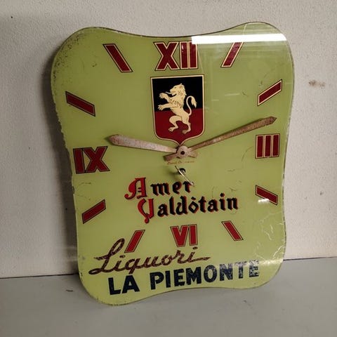 Vintage vægur med Campari originale, formet som en rød prop med tekst og en stiliseret flaske.