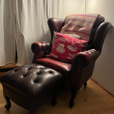 Denne klassiske Chesterfield-ørefotel er udført i en særligt tiltalende farve, der subtilt bevæger sig mellem sort og blå. Læderet har et smukt patineret overflade, der vidner om karakter og ægthed, uden at der er skader. Fotelens design udstråler den tidløse elegance, der er kendetegnet ved Chesterfield-designet, med royale ører, en dyb siddeplads og en rygstøtte med den karakteristiske knapdeling. Patinaen giver møblet en varm, levet udstråling, mens det er i fremragende stand og klar til brug i ethvert interiør, hvor stil og komfort går hånd i hånd.