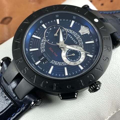 Versace V-Race Dual Time VEBV004, 45 mm rustfrit stålkröne med sort PVD-belægning, blå skive, safirglas, schweizisk kvartsur, blå læderrem, original æske og papirer, ny, håndledsmål 21 cm, forsikret forsendelse. Klik på den blå "gå til varen" knap, for at købe eller byde på denne vare. Den samlede pris vil blive vist inden du afgiver dit bud.