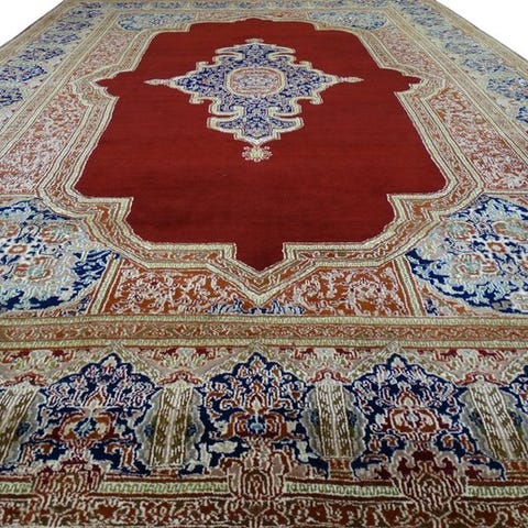 Farvepaletten i dette tæppe domineres ofte af en klassisk rubinrød, ædel mørkeblå, eller varm elfenbein. Det