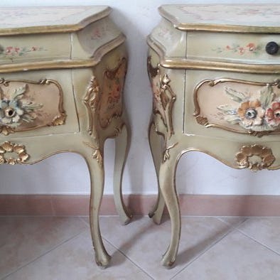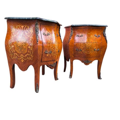 Frontbenene viser en yndefuld cabriole-form, afsluttet med guldmetal saboter og bladmotiverede beslag, mens bagbenene er let spredte for stabilitet. Disse natborde bevarer deres originale finish og udviser den charmerende slitage, der er typisk for alder, hvilket øger deres antikke appel.