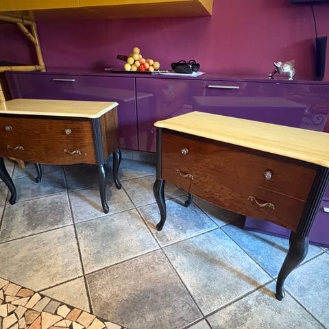 Natborde med en øverste skuffe og et nederste rum med svingdør. Håndtag i messing.