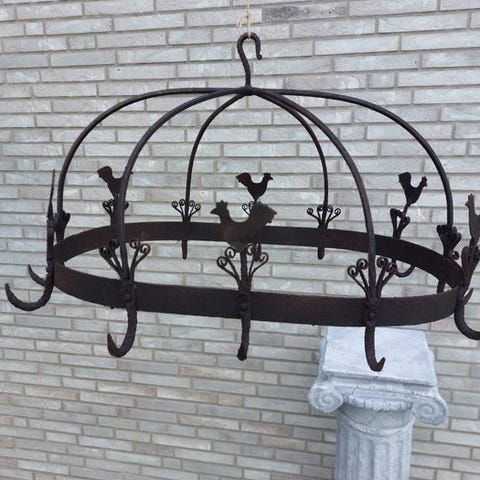 Gammelt fransk hængefor smedjern med tolv kroge til fasaner og agerhøns, fra 1960–1970, i god brugt stand med små tegn på ælde, sortrustet overflade, oprindelse Frankrig, mål: høj 40 cm, bred 50 cm, dyb 65 cm. Klik på den blå "gå til varen" knap, for at købe eller byde på denne vare. Den samlede pris vil blive vist inden du afgiver dit bud.