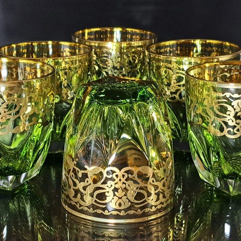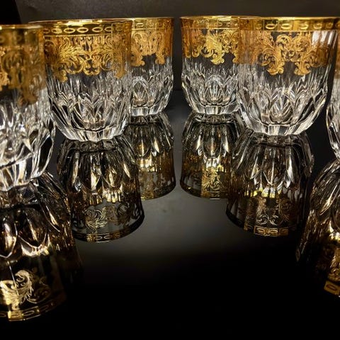 Den elegante gulddekoration påføres manuelt med ensartede penselstrøg, hvilket kan føre til næsten usynlige forskelle mellem et glas og et andet, hvilket sikrer produktets håndværksmæssige kvalitet.