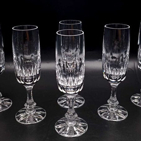 Smukt sæt med 6 fluteglas i krystal med pimbo (24%+), helt håndlavet af ægte mestre Pail, model Domino.