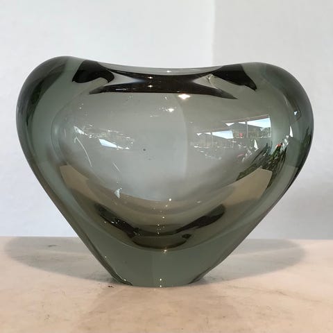 Smuk stor lyseblå hjerteformet tung / massiv glasvase fra Holmegaard. Design Per Lütken i 1950’erne. Fremstår med lidt brugsspor. Måler 14 cm i bredden, er 11 cm høj og 8,5 cm dyb. Pæn, ren og i orden, fra ikke-ryger hjem.