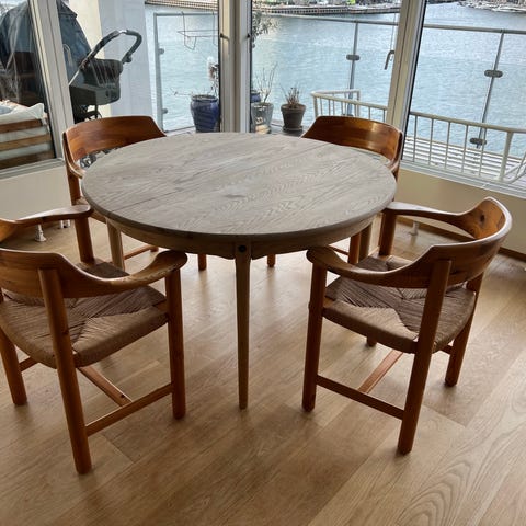 Sæt af bord og 4 stole i massiv gylden fyr. Bord såvel som stole er i en enkel nærmest skulpturel form. Uden tvivl det flotteste af Rainers designs.