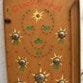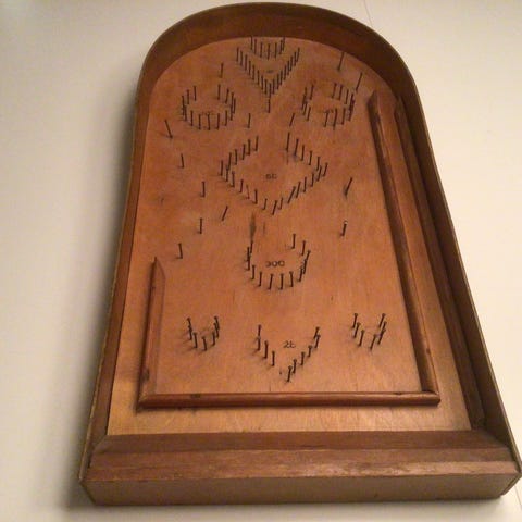 Træ ramme med papir tryk på masonit plade. Knap søm og træ skåle samt stål kugle