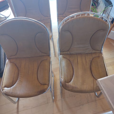 To frisvinger armstole med hvidt læder, forcromede stel med hvidt kernelæder i ryg og sæde samt på armlæn. Ryghøjde 77 cm, B. 61 cm, sædehøjde 46 cm.
